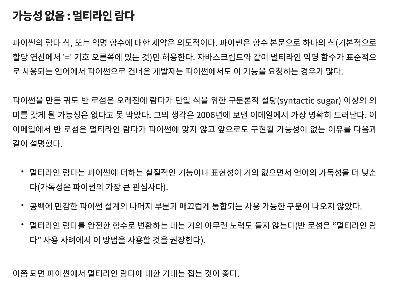 - 람다에서 들여쓰기로 multi line을 사용하면, 들여 쓰기 기반 블록을 포함하는 솔루션을 받아 들일 수 없다.